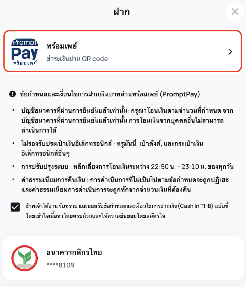 จากรายการช่องทางการฝากเงิน ให้เลือก “พร้อมเพย์”