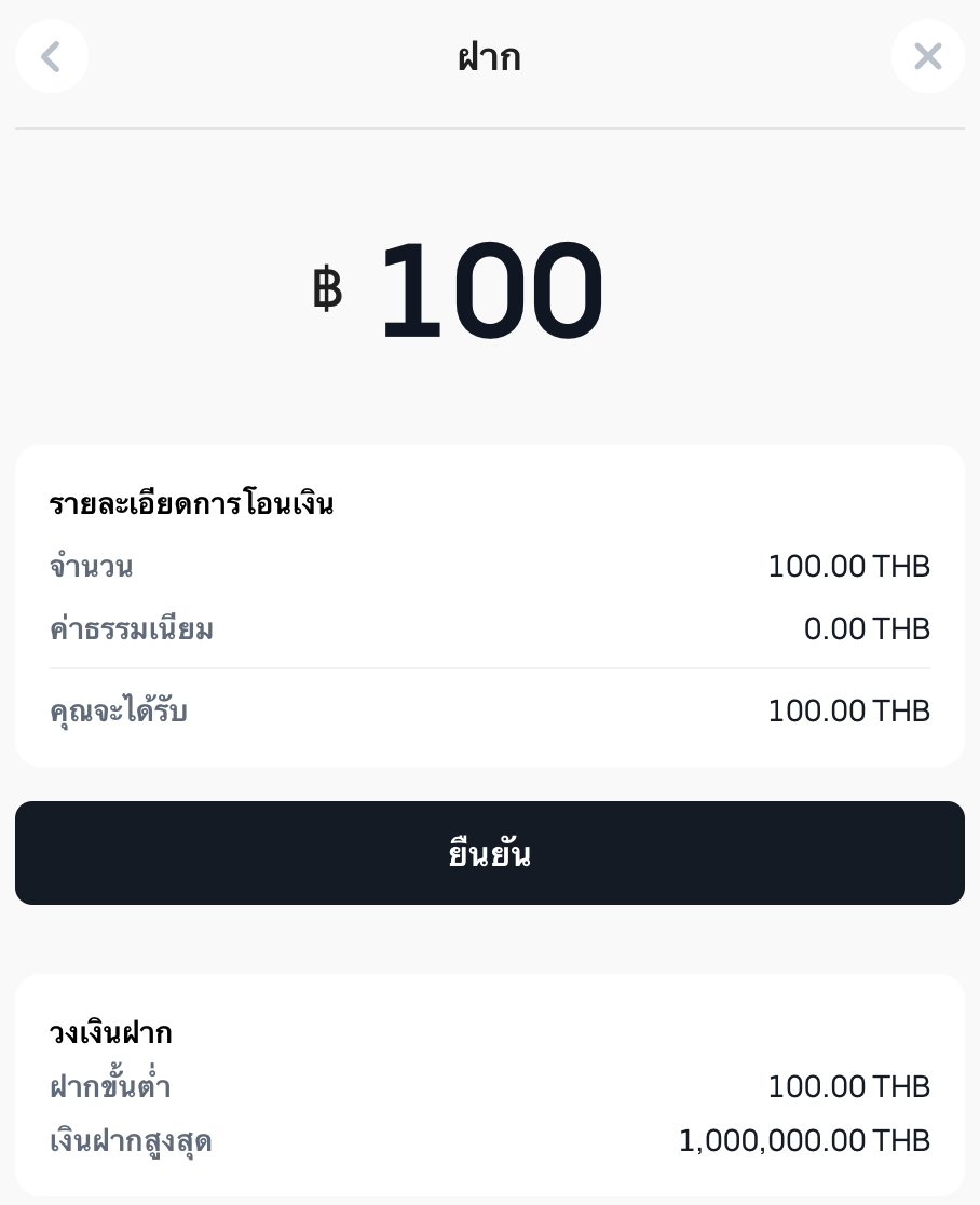 กรอกจำนวนเงิน (THB) ที่ต้องการฝาก คลิก “ยืนยัน”